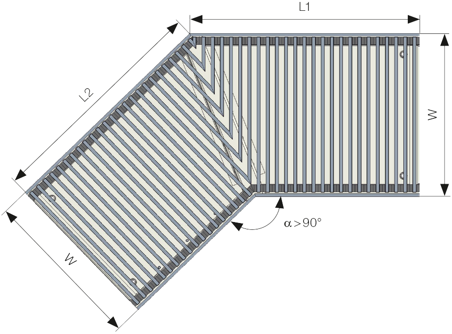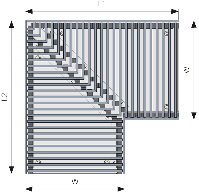 Corner parts are the ideal solution to ensure seamless connections of KORAFLEX trench heaters in the corners of rooms. Corner parts are supplied complete as one unit and can be fitted with all types of grille. Heat exchangers cannot be placed in corner parts – corner parts are optional decorative accessories and as such have no effect on heat output. Corner parts must be ordered together with the relevant trench heaters and grilles.