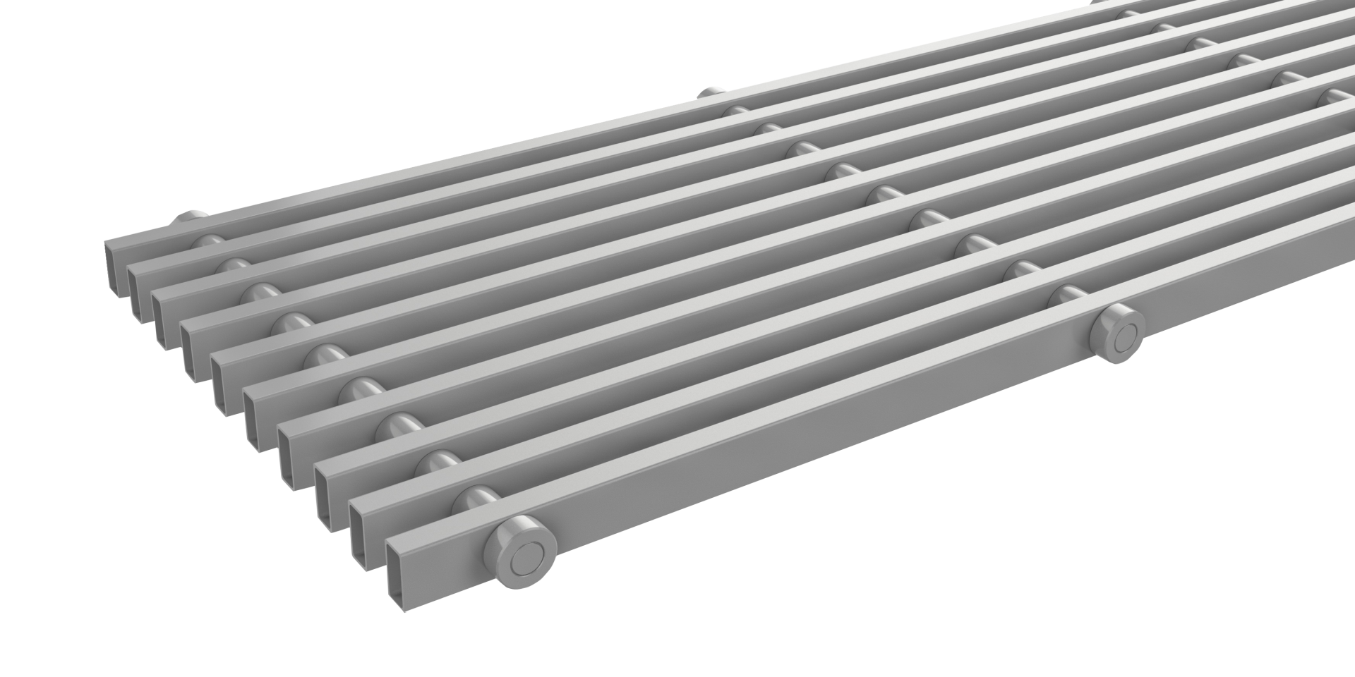 Floor grille length 100 cm, width 26 cm, steel model, RAL 9006 colour (grey) lacquered, roll-up, for single trench heater without alteration. Grille measurement, given in the order code, corresponds with the measurement of the respective trench heater. Nett dimension of the grille is available upon request.