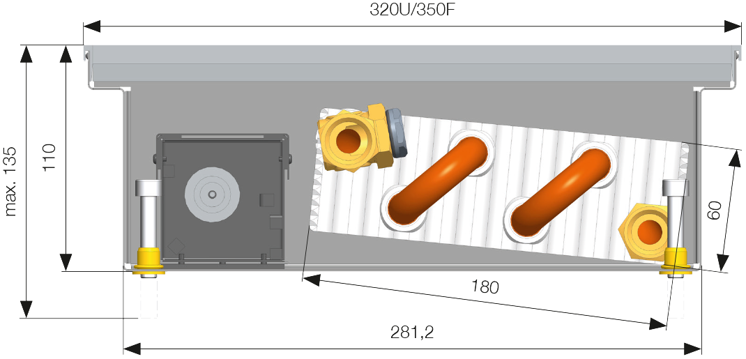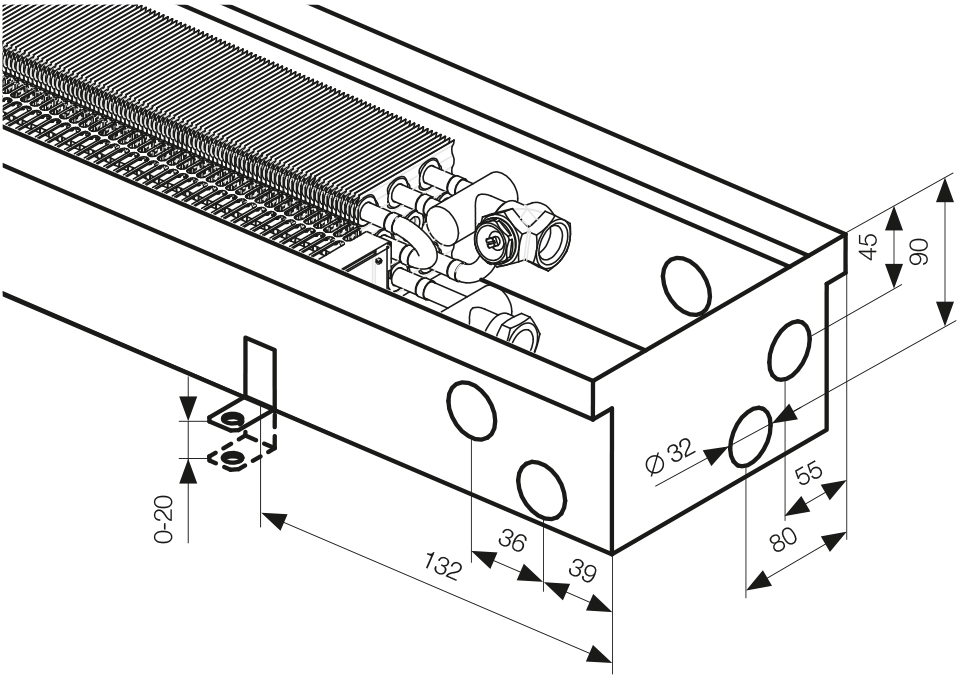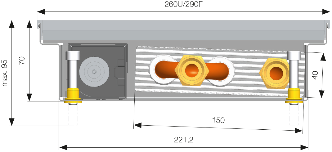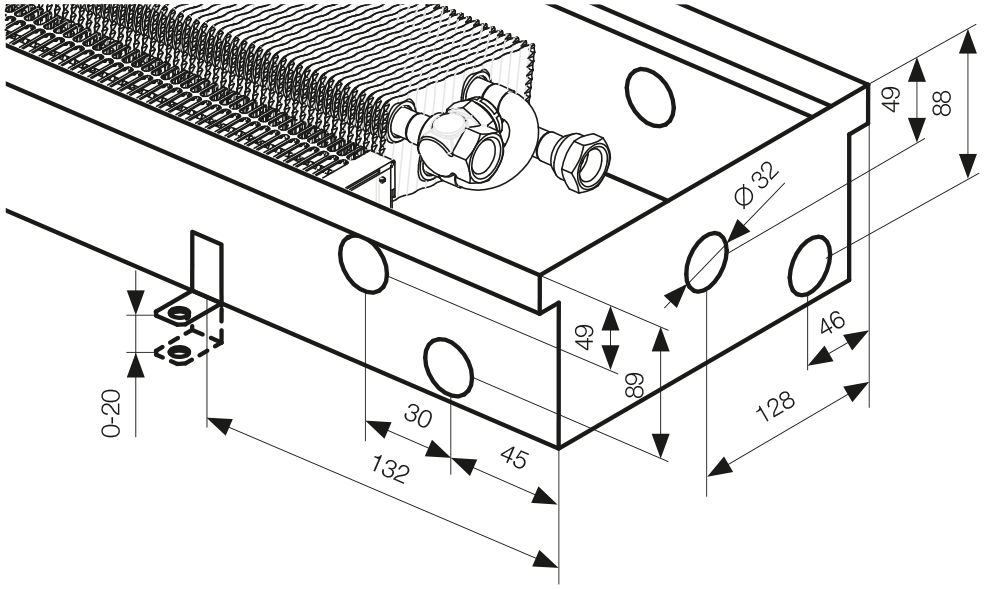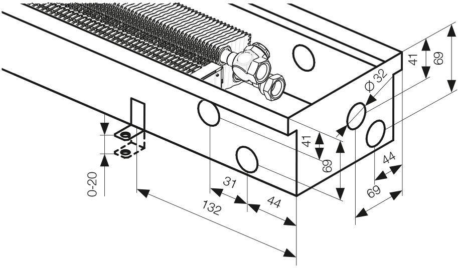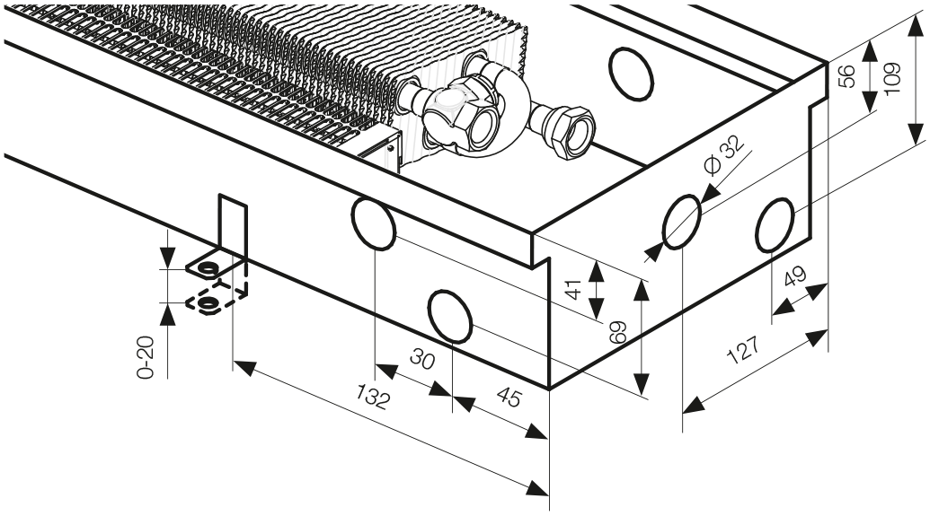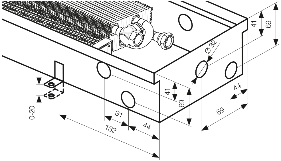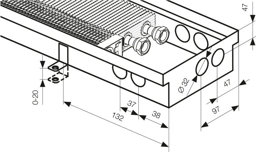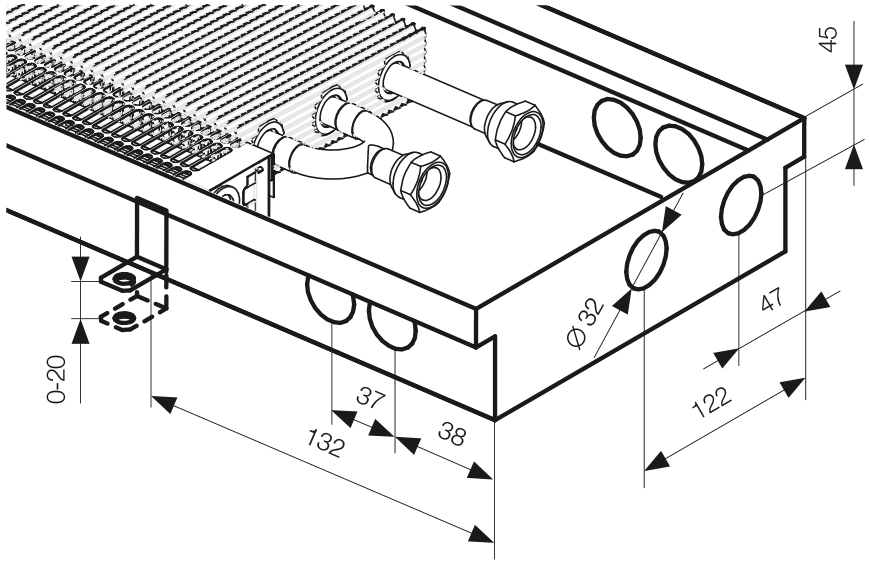 Trench heaters are fitted with reinforcing bars and set screws, which enable the trench heater to be installed at the required height. Set screws must be anchored to the floor to prevent movement. Reinforcing bars are not included as standard and cannot be fitted subsequently. The screws allow setting a maximum height which is max. 30 mm higher than the trench heater itself. Recommended for raised floors with a maximum depth 30 mm greater than the unit height of the trench heater.