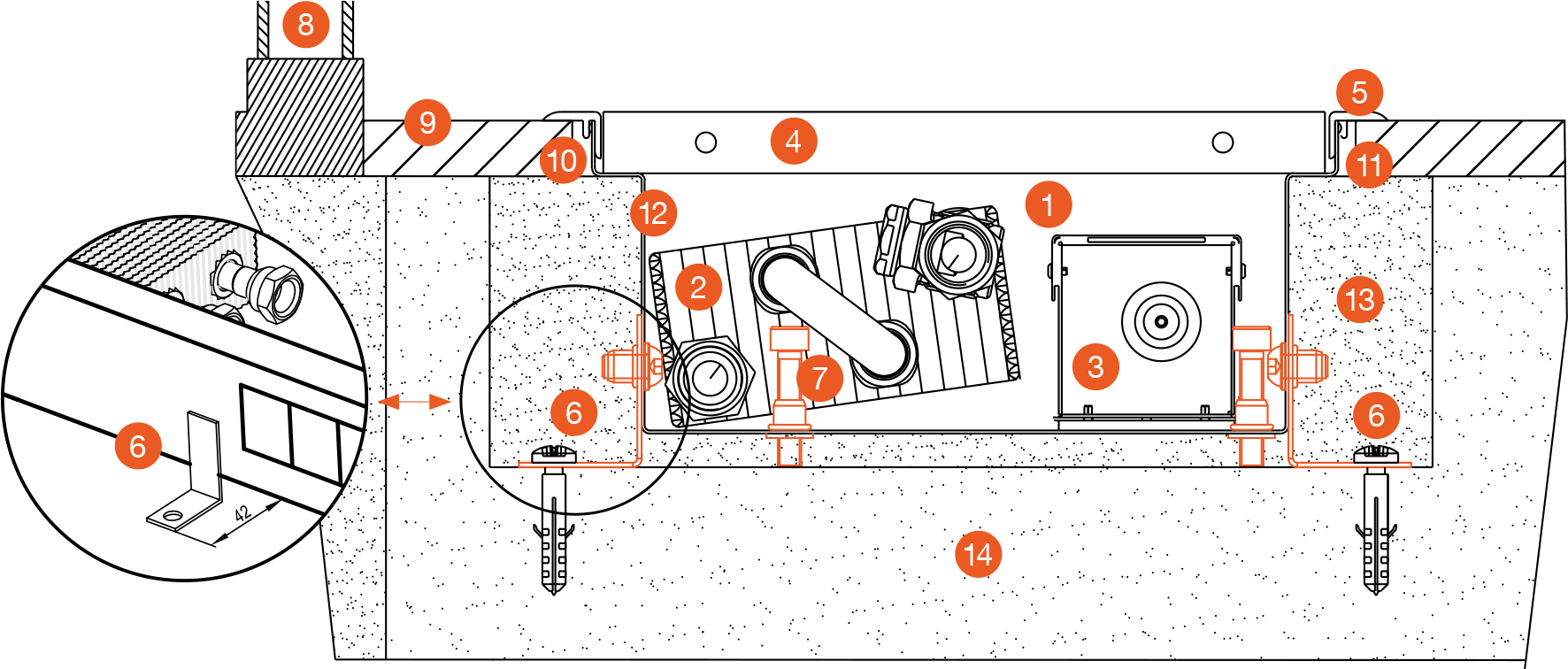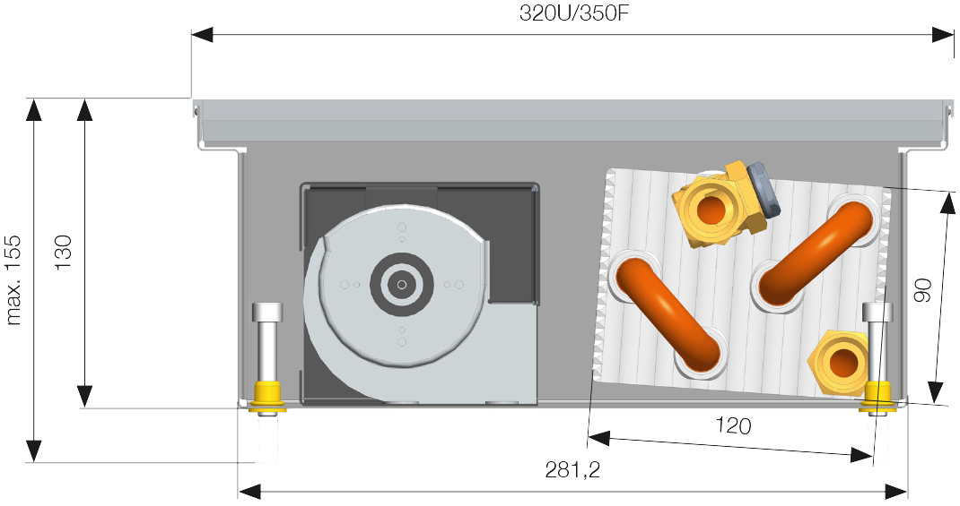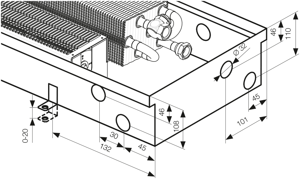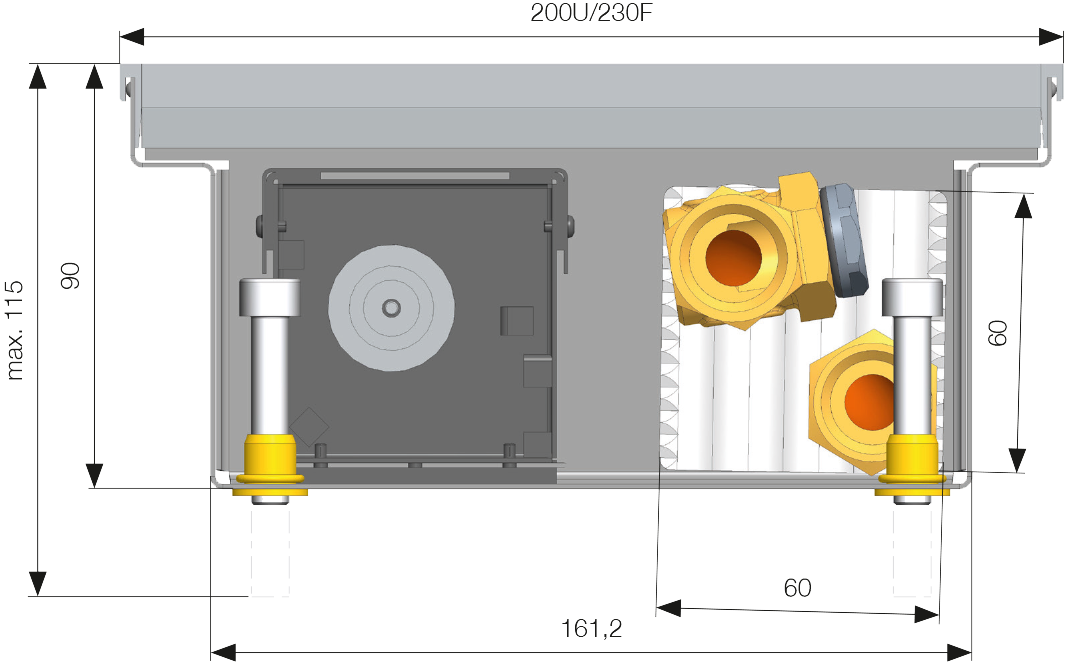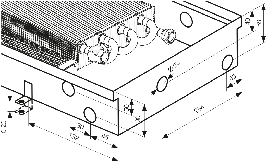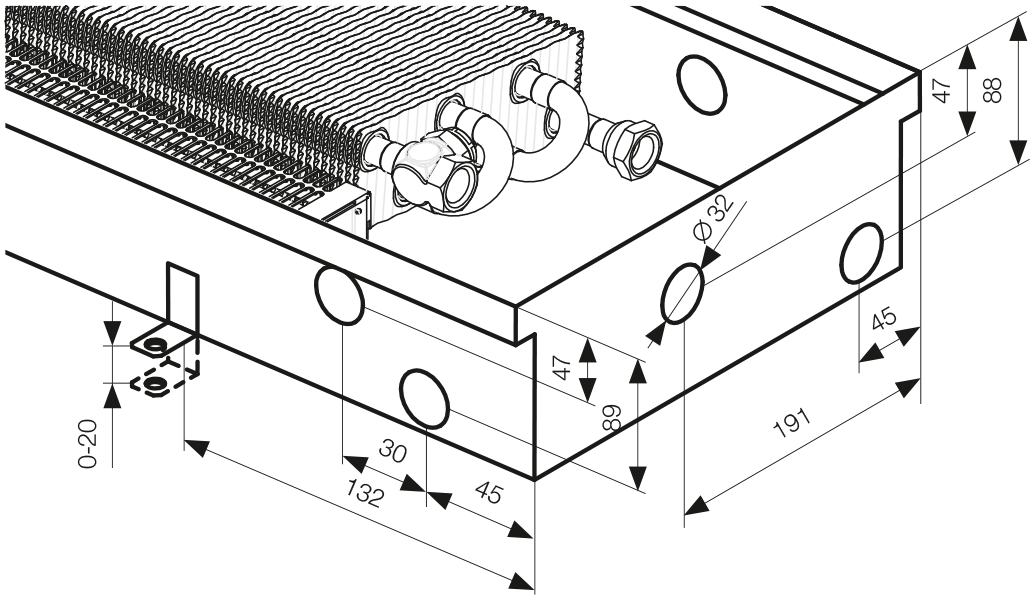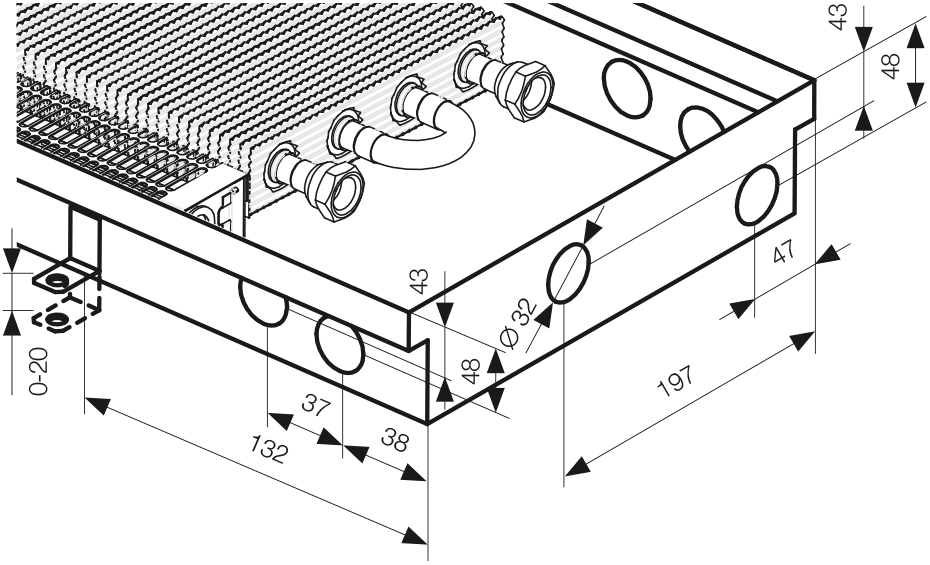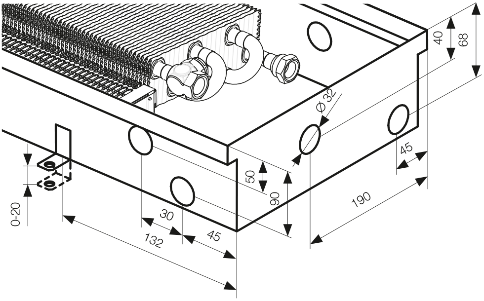 Trench heaters are fitted with reinforcing bars and set screws, which enable the trench heater to be installed at the required height. Set screws must be anchored to the floor to prevent movement. Reinforcing bars are not included as standard and cannot be fitted subsequently. The screws allow setting a maximum height which is max. 30 mm higher than the trench heater itself. Recommended for raised floors with a maximum depth 30 mm greater than the unit height of the trench heater.