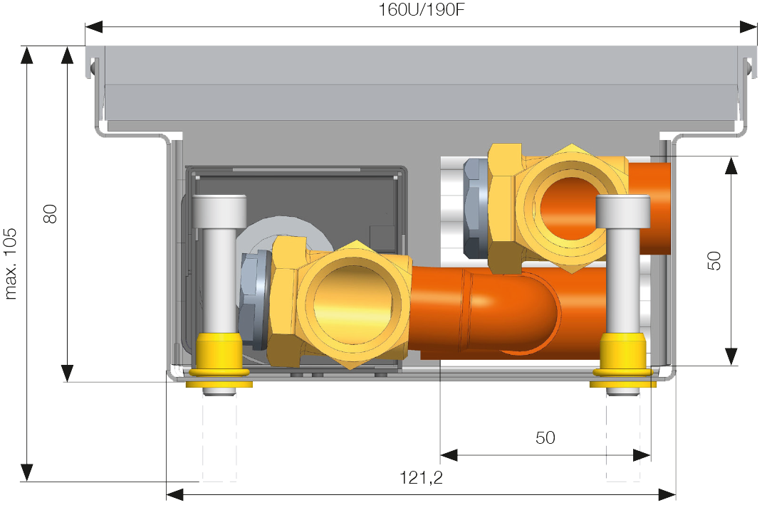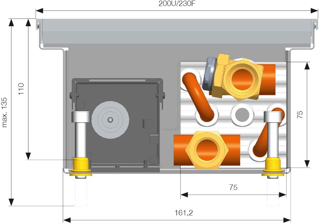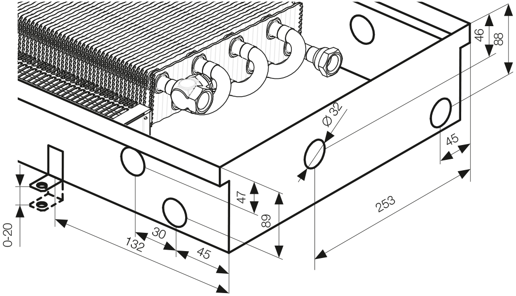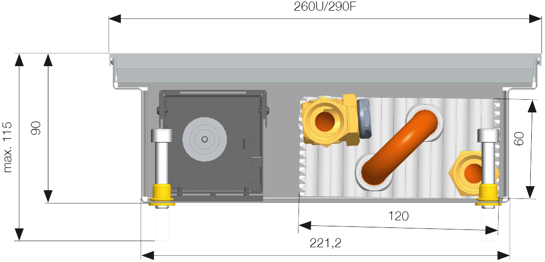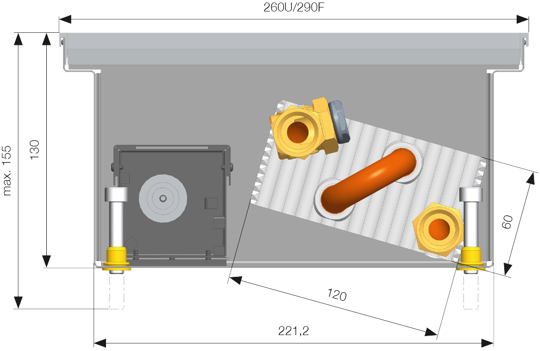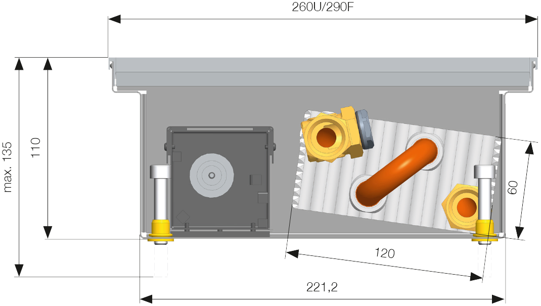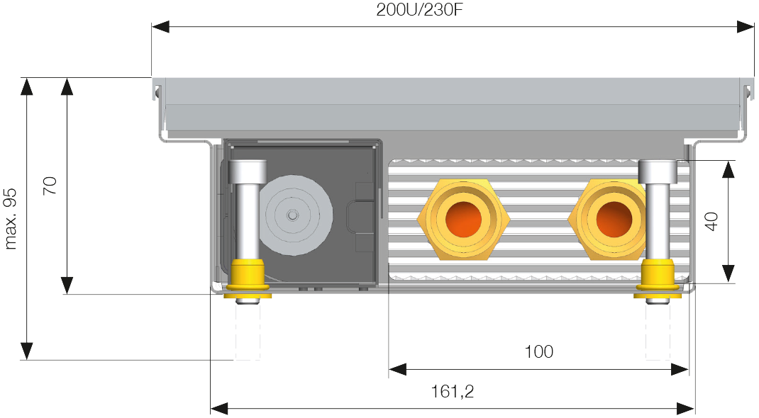 Trench heaters are fitted with reinforcing bars and set screws, which enable the trench heater to be installed at the required height. Set screws must be anchored to the floor to prevent movement. Reinforcing bars are not included as standard and cannot be fitted subsequently. The screws allow setting a maximum height which is max. 30 mm higher than the trench heater itself. Recommended for raised floors with a maximum depth 30 mm greater than the unit height of the trench heater.