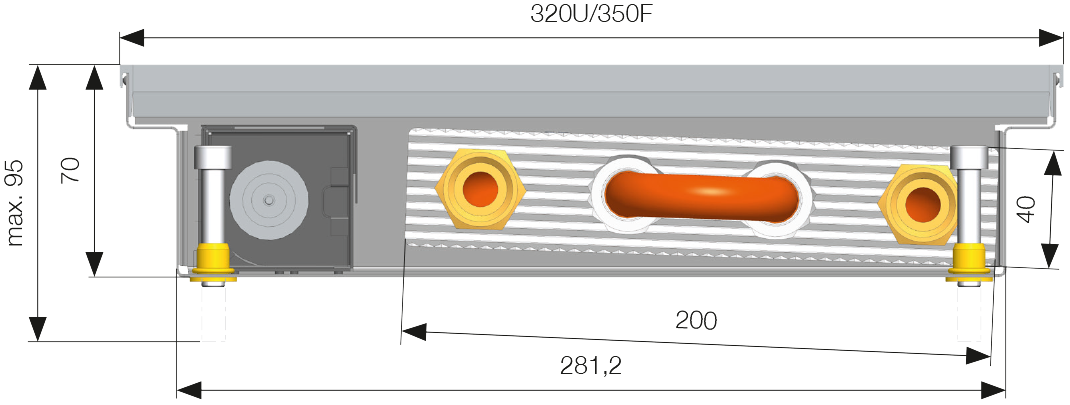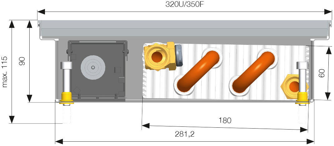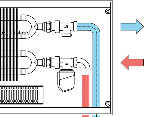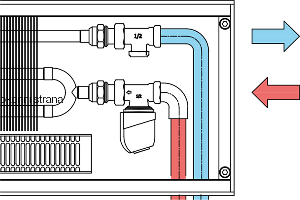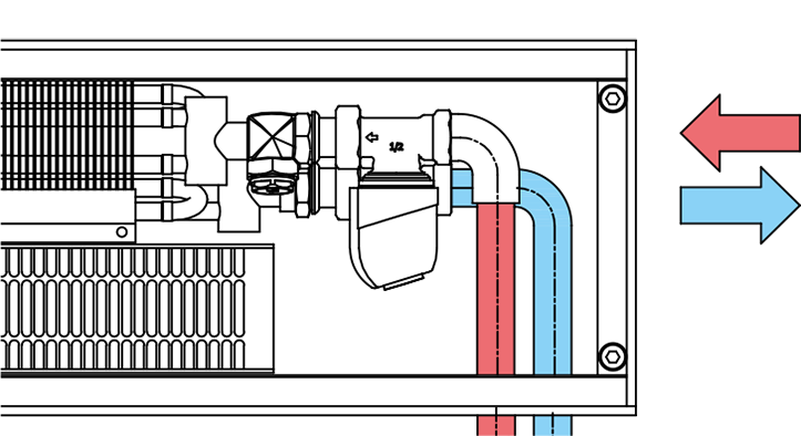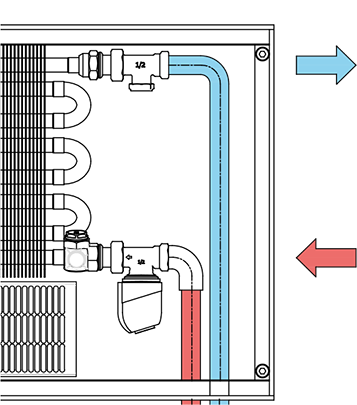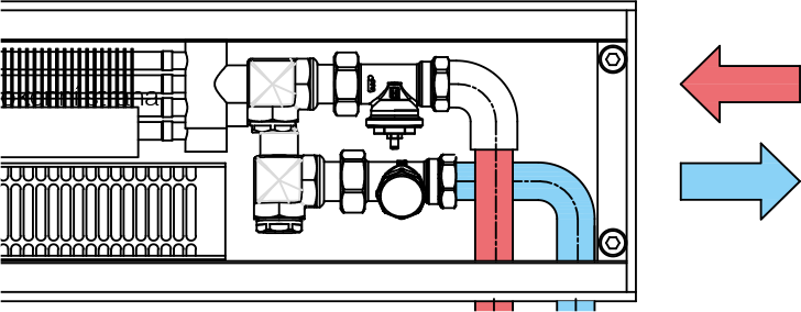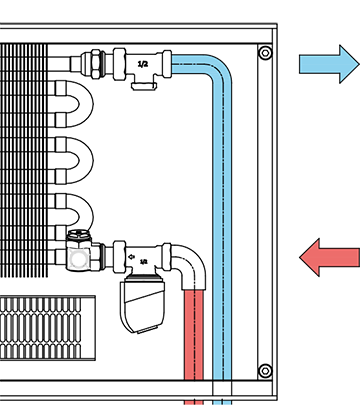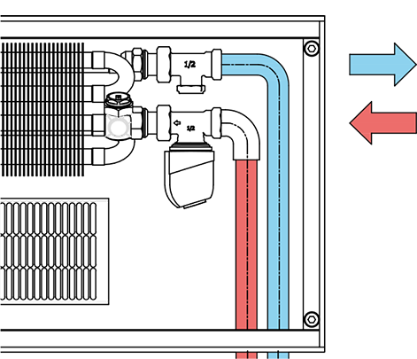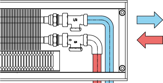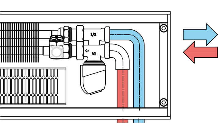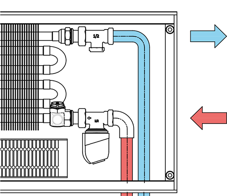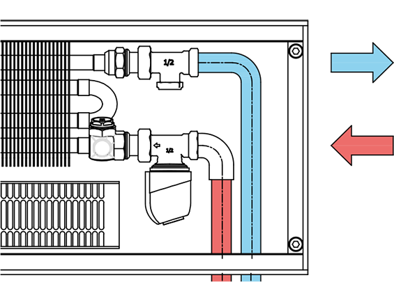 - We recommend connecting the trench heater to the heating system using a lockshield and thermostatic valve. The heat exchanger connection is by an inner G½ thread. Following connection to the heating system, bleed and carry out a pressure test.