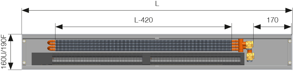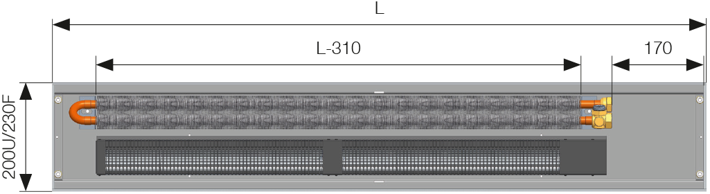 KORAFLEX trench heater with fan (forced convection), 230 V AC Energy model, length 120 cm, depth 11 cm, width 26 cm, counter-flow non-lacquered heat exchanger U-frame, silver elox, right-hand connection, without lowered face, for roll-up grille, with 230 V AC regulation.