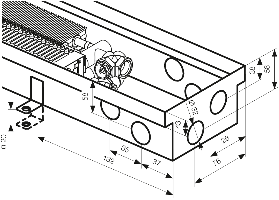 - The size of the trough in the floor for trench heater installation should be at least 100 mm bigger (both in length and width) than the convector.