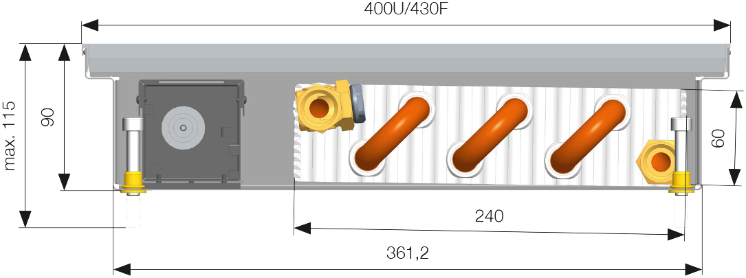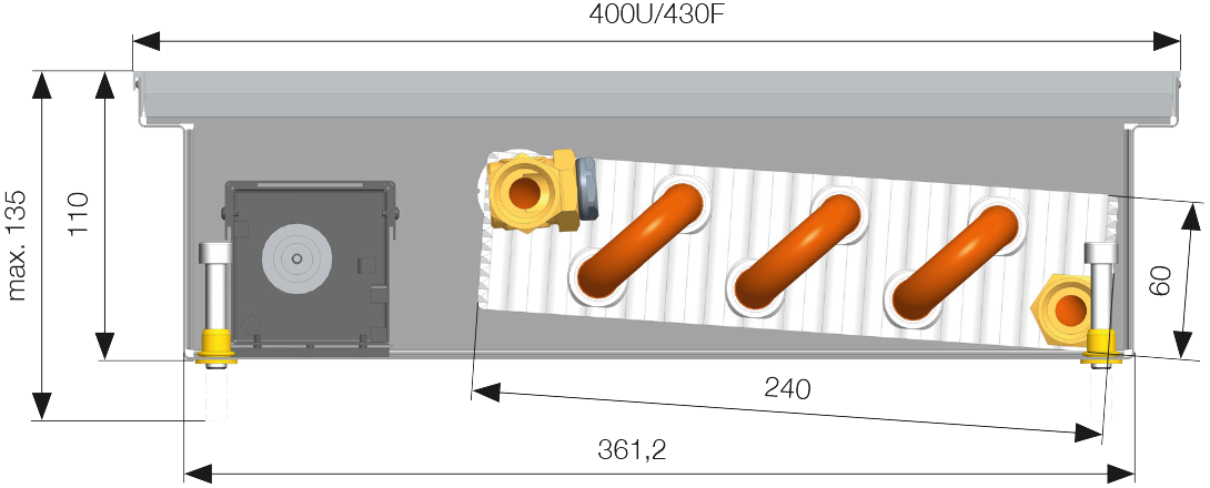 KORAFLEX Energy FVE is based on the Optimal-V range, extended by 200mm and fitted with regulation for 230 V AC connection. Energy 230 V AC trench heaters are suitable for dry environments and are solely for heating. They are characterized by silent operation and can be connected to BMS (Building Management System).