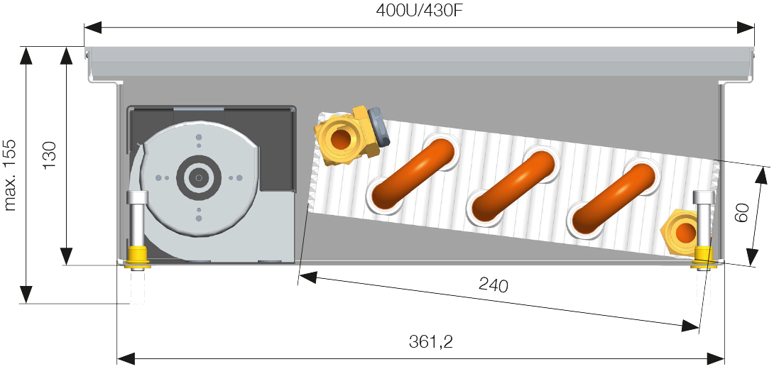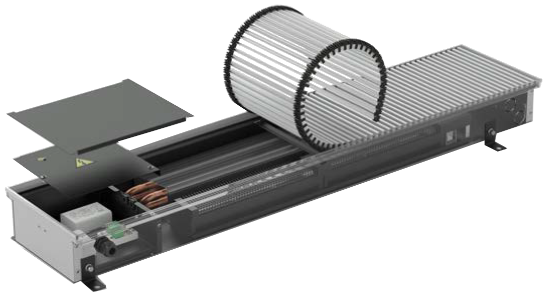 KORAFLEX Energy FVE trench heaters are powered with 230 V alternating current mains electricity. Therefore the electric branch must be equipped with a residual current device with a tripping current of 30 mA. These trench heaters are to be used solely in dry environments, and only for heating.1- trench heater with forced convection, 2 - heat exchanger, 3 - fan, 4 - grille, 5 - F-frame,