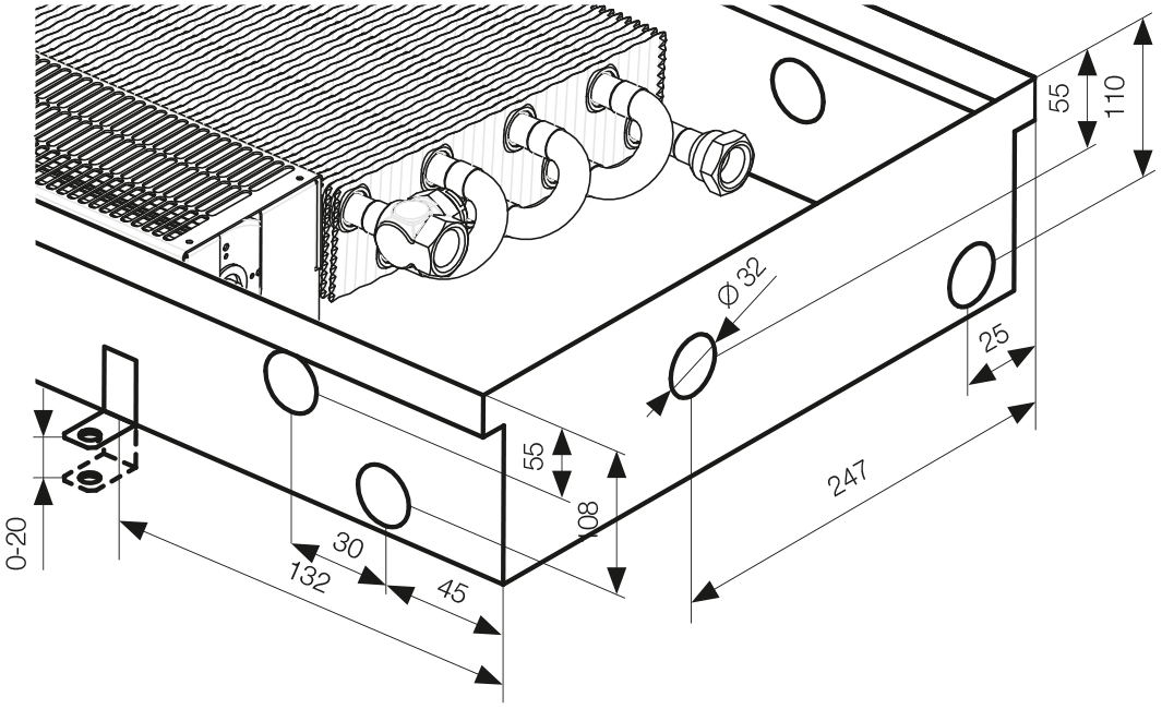 - For trench heaters with forced convection we recommend undertaking fastening and acoustic insulation by pouring thin concrete along the sides and under the base of the heater.