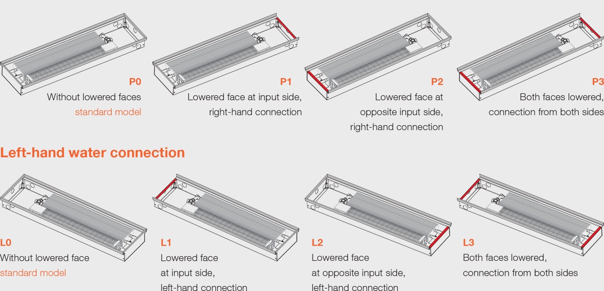 Lowered trench heater casing faces are used where invisible connections are desired between convectors (multiple convectors around a room, eg. in administrative buildings, restaurants, hotels, etc.). When ordering grilles, care must be taken to include information in the order code that the grilles required are to be used with trench heaters with lowered faces.