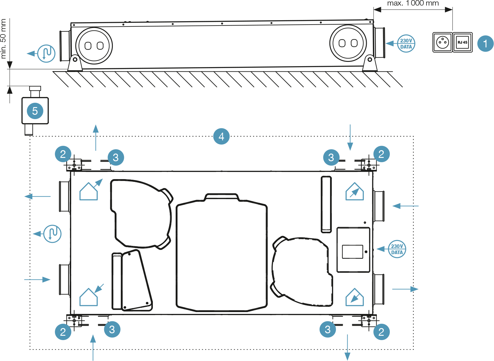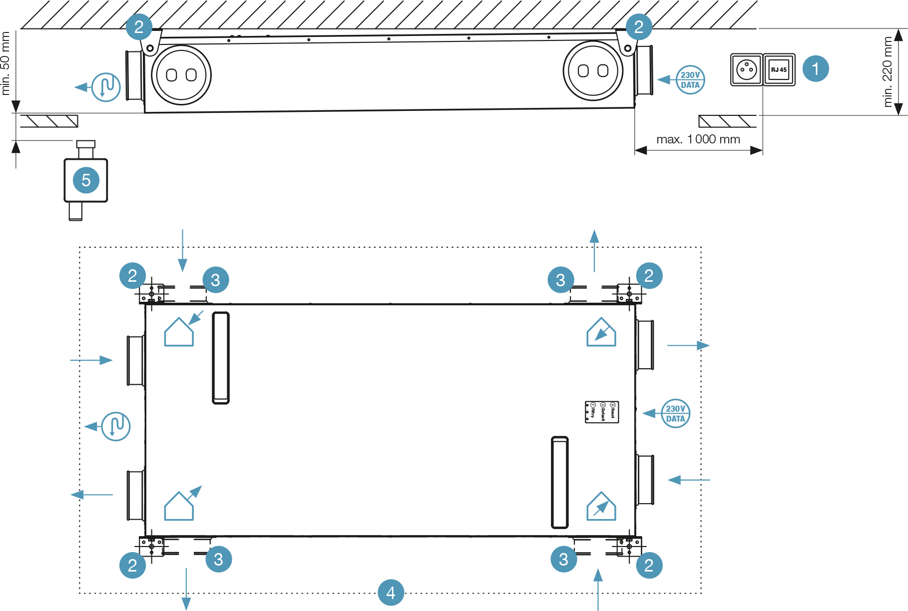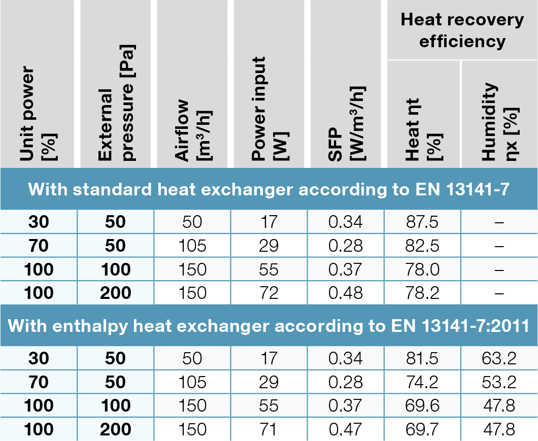 | Electrical input (without preheating) | 55 W/150 m³/h; 29 W/105 m³/h; 17 W/50 m³/h |