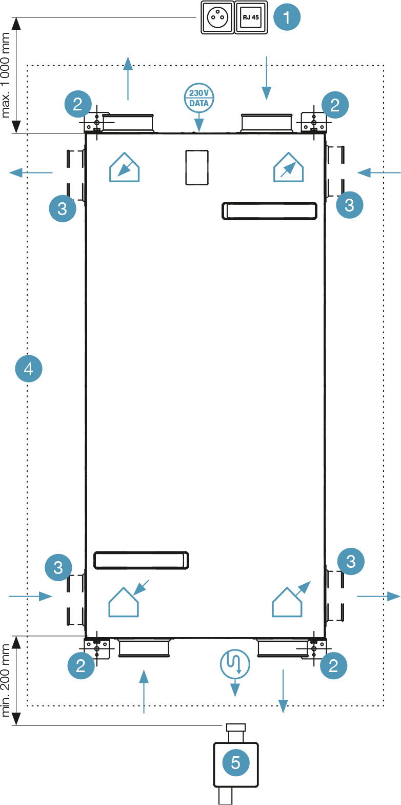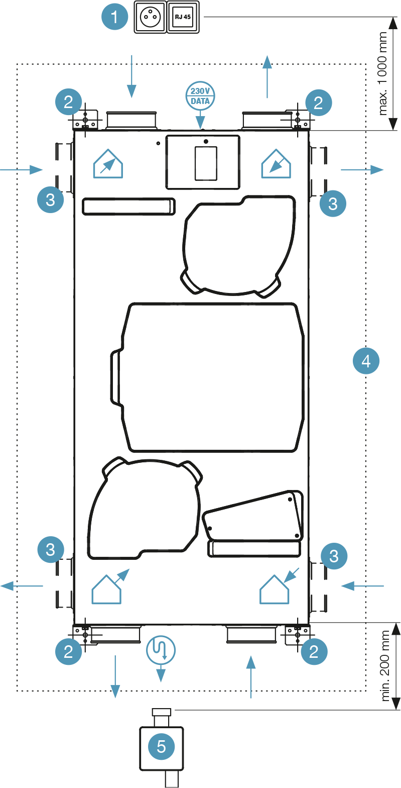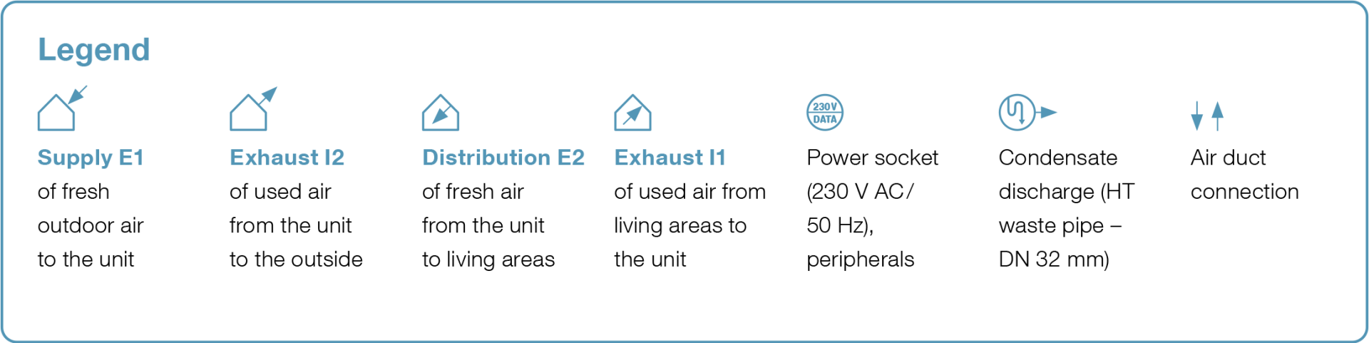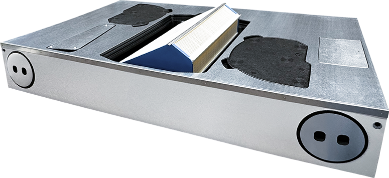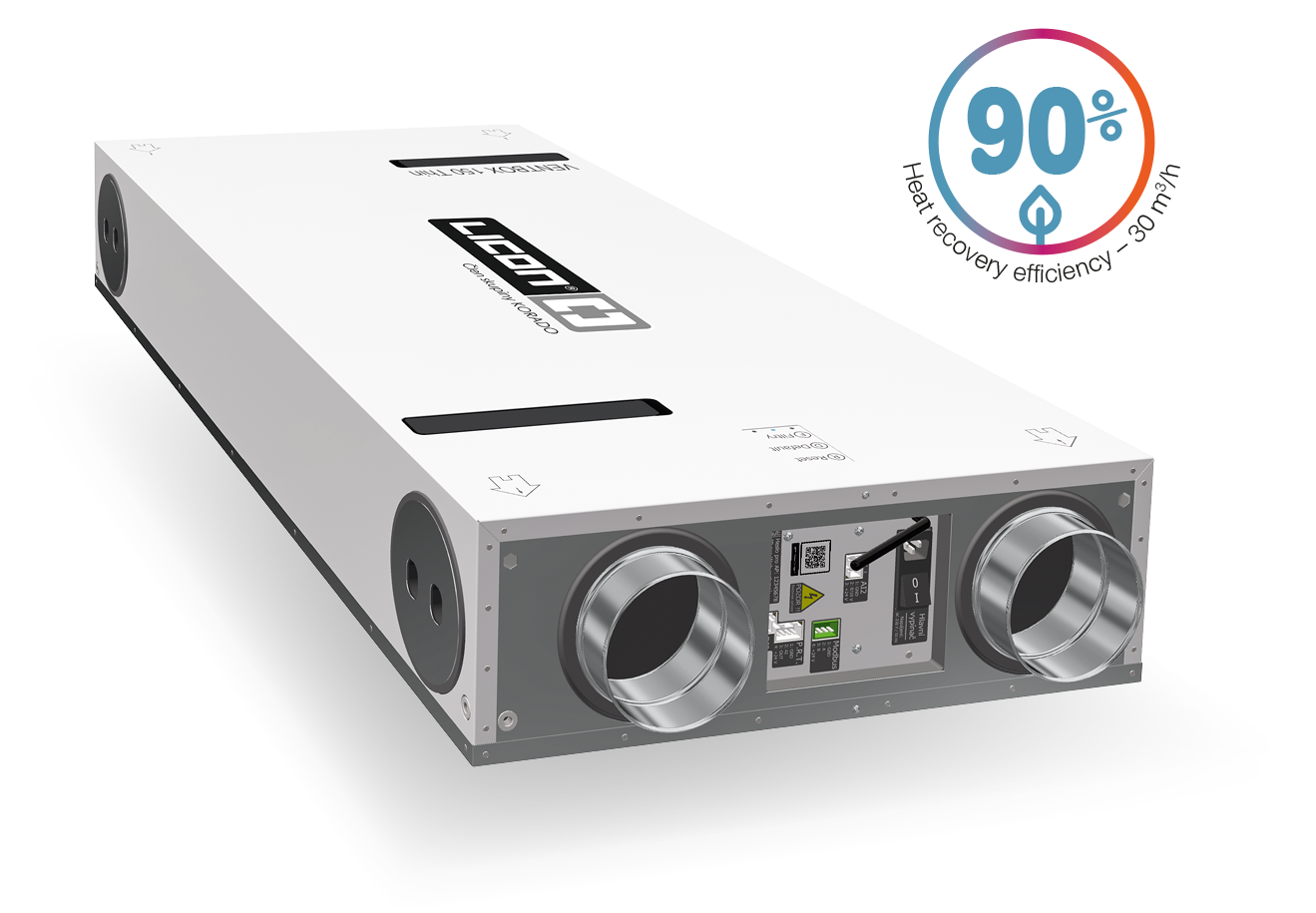 The unit is additionally equipped with unrivalled motors with constant flow function. These unique fans compensate for pressure losses (e.g. in case of flow blockage at the inlet). With these premium EC motors, the unit can operate more efficiently and economically; this has a positive effect on the overall dynamics and also the economy when using the heat recovery system. Compensation for changes in pressure losses in the system, e.g. when the filters gradually become clogged. Ensuring uniform ventilation and high efficiency of heat recovery. The unit is more sophisticated.