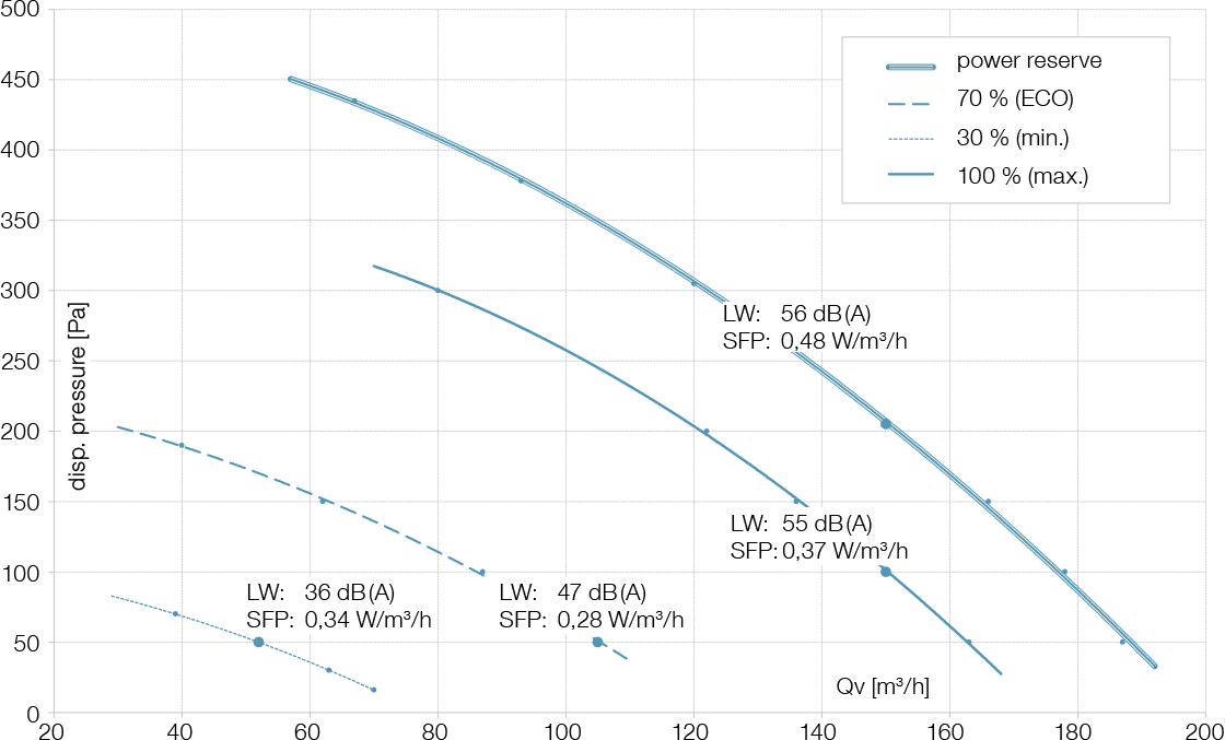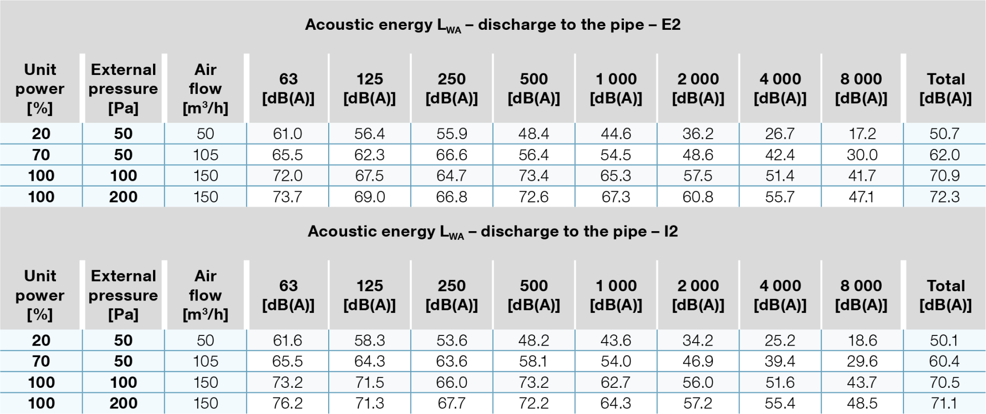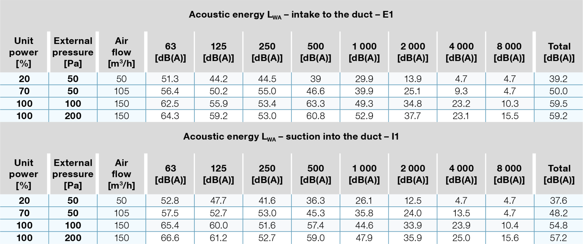 | Acoustic energy LWA [m³/h/Pa/dB] | 105 m³/h/50 Pa/46,9 dB |