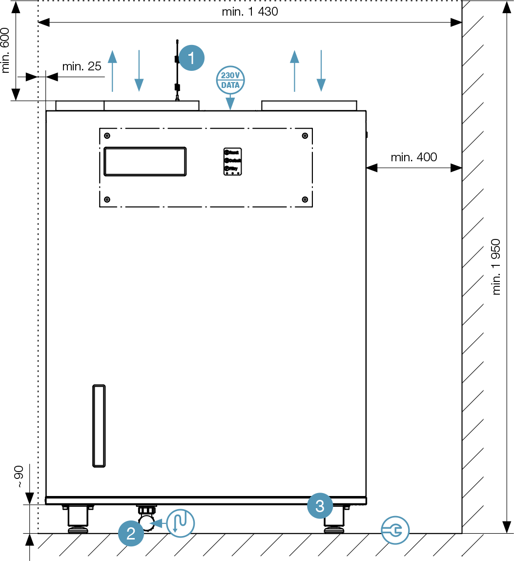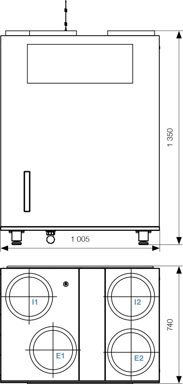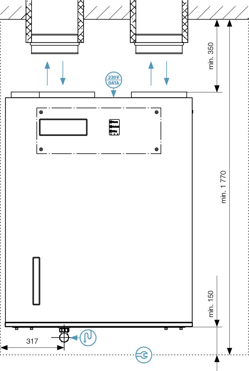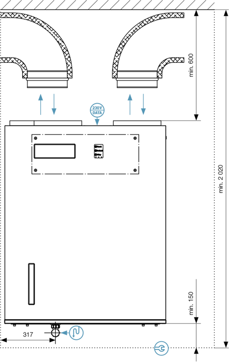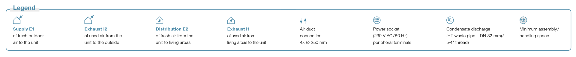 | Electrical input (without preheating) | 240 W/800 m³/h; 105 W/560 m³/h; 20 W/120 m³/h | |