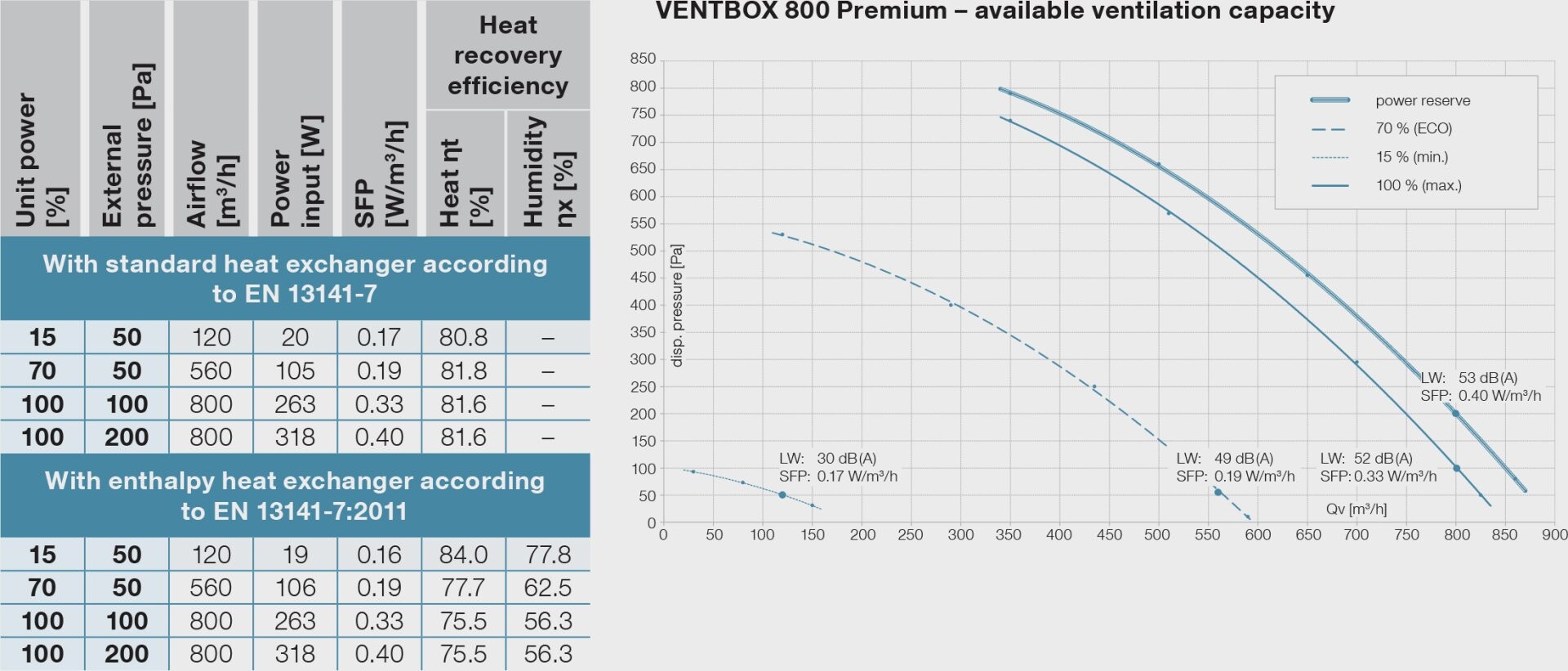 | Maximum airflow in BOOST setting [m³/h] | 800 m³/h | |